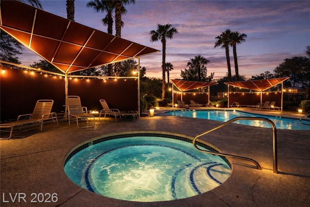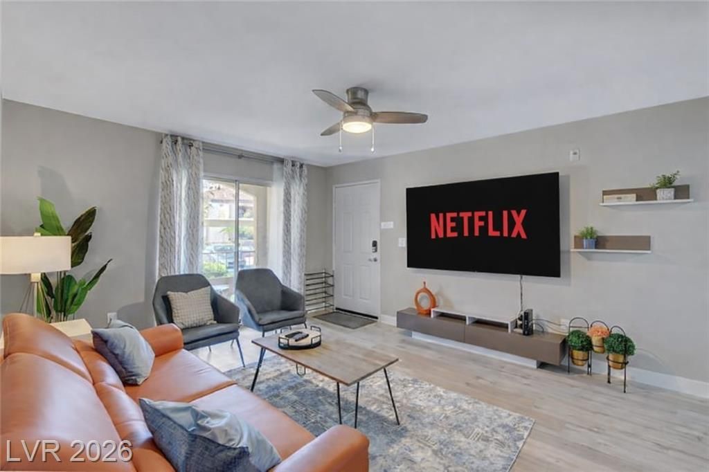 Beautifully updated 2-bedroom, 2-bathroom first-floor condo located in the gated Rancho Viejo community. This fully furnished 934 sq ft unit features an open living and dining area, hardwood flooring, marble countertops, recessed lighting, and in-unit washer and dryer. Spacious layout with two comfortable bedrooms and two full bathrooms. Covered parking included. Internet-ready. Enjoy resort-style living with community amenities including a swimming pool, spa, fitness center, BBQ areas, and well-maintained landscaped grounds within a secure, gated neighborhood. Conveniently located near Summerlin and Southwest Las Vegas with easy access to I-215. Just minutes from the Las Vegas Strip, Allegiant Stadium, T-Mobile Arena, shopping, dining, and everyday conveniences. Ideal for those seeking comfort, convenience, and a prime Las Vegas location.